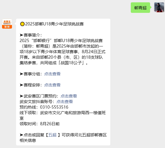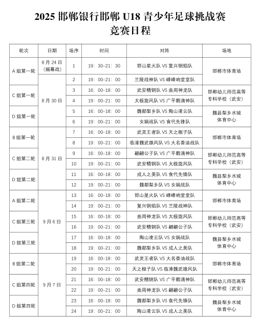 赛事简介2025“邯郸银行”邯郸U18青少年足球挑战赛(简称:郸青超)是2025年由邯郸市发起的一项18岁以下青少年体育足球赛事,8月24日正式开赛。来自邯郸20个县(市、区)的18支球队集结参赛,共同组成「战国18公子」。